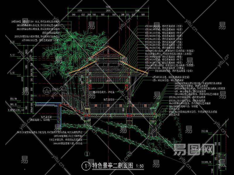 新中式重檐四角木亭及木栏杆台阶挡墙区域做法详图